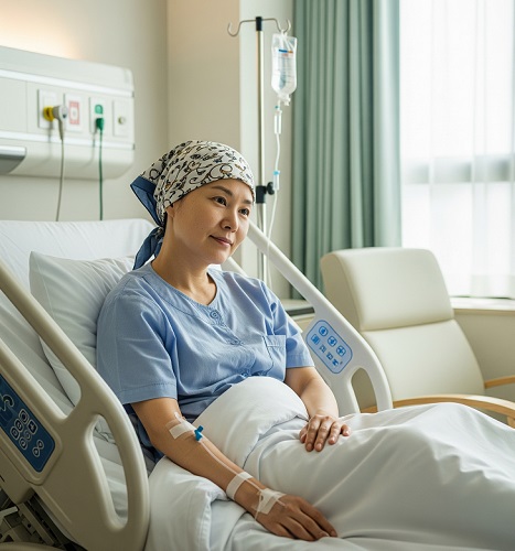 항암치료를 받으며 병실 침대에 누워 있는 두건을 착용한 여성 유방암 환자의 모습